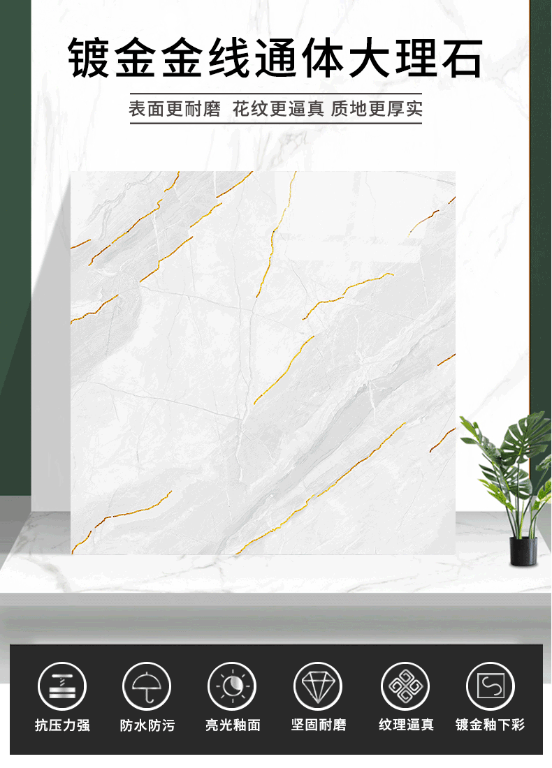 金線金粉 【產(chǎn)品介紹】航天級激光鍍金工藝,鉆石雕刻技術(shù),高溫慢燒,釉層不吸污吸水率低,真空鍍金燒成后再進(jìn)行真空電鍍工藝,平整如鏡面,精拋細(xì)磨,磚面平整光滑細(xì)膩光澤度、亮度、硬度較高。立體紋理,釉下彩工藝,三次淋釉增加磚面的立體感。