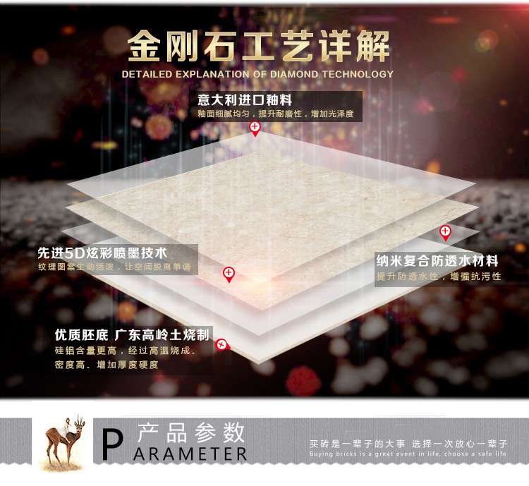 金曼古瓷磚廠家特價金剛石因高品質而得名,是一款極具天然石材效果和微晶石質感的仿石材瓷磚,它不但在價格、環保、耐用和清潔上極具優勢,在質感、規格、花色、重量等指標上,金剛石都遠遠勝于石材、拋光磚。相比其他種類的產品,它最大的特點可以用“高亮度、高耐磨、高平整、高逼真、高清晰、高環保”。