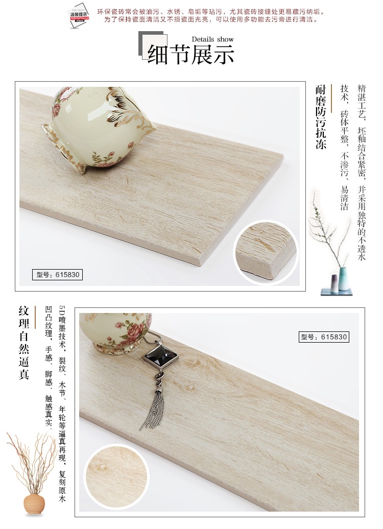 金曼古木紋磚,是一種表面呈現木紋裝飾圖案的環保建材.紋路逼真、自然樸實、沒有木地板褪色、不耐磨等缺點;曼古陶瓷木紋磚系列線條明快,圖案清晰為特色。本身具有阻燃,不腐蝕的特點,綠色、環保型建材;產品使用壽命長,耐磨,無需像木制產品那樣周期性地打蠟保養等.