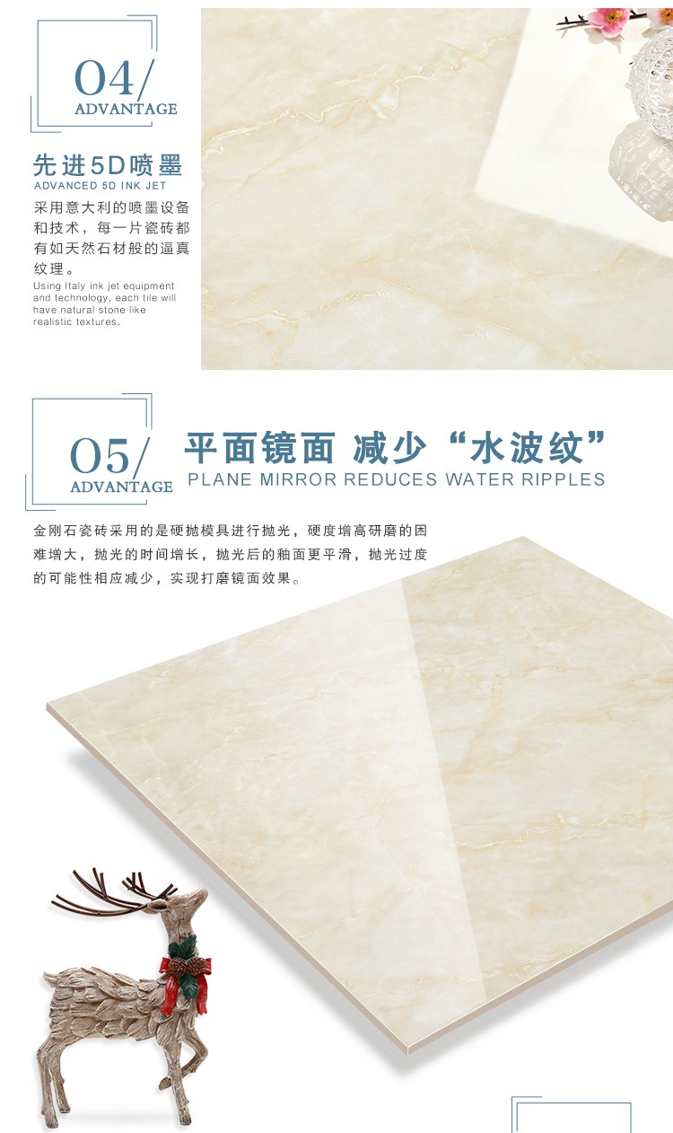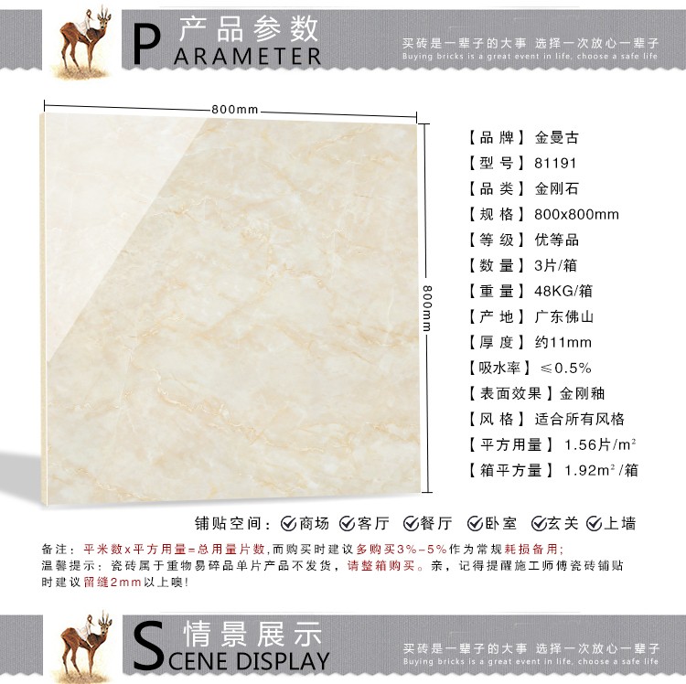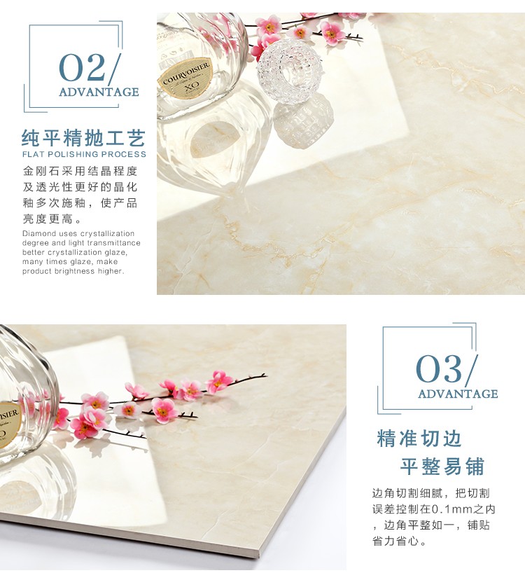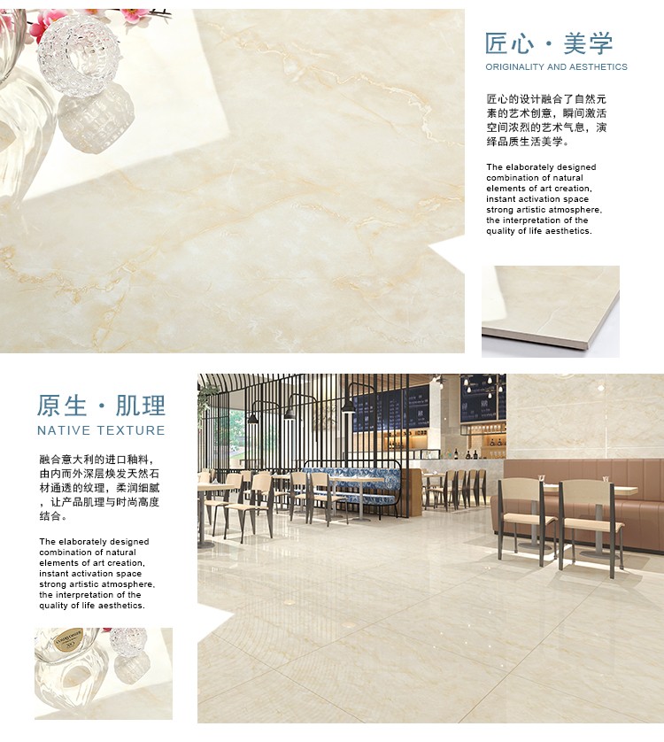 金曼古全拋釉瓷磚運(yùn)用多層特殊制造工藝,將全透析釉料下彩技術(shù)結(jié)合先進(jìn)印刷工藝,令花紋俯在下層,低碳能源、清潔生產(chǎn),表面光潔剔透,獨(dú)有釉料精拋工序,集拋光磚與仿古磚優(yōu)點(diǎn)于一體,釉面如拋光磚般光滑亮潔,同時(shí)其釉面花色如仿古磚般圖案豐富,色彩厚重或絢麗。