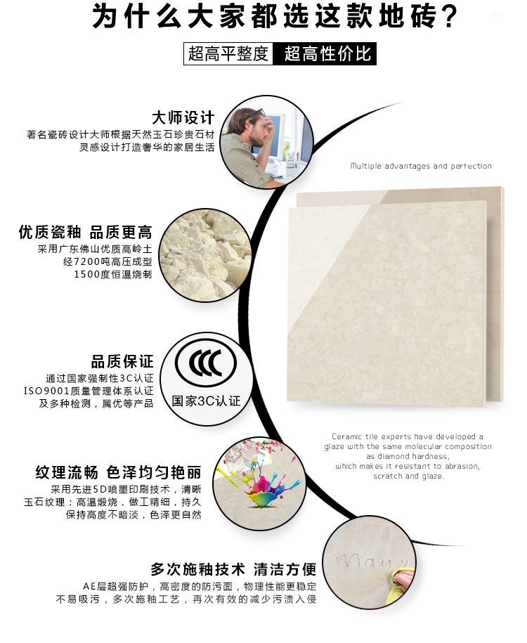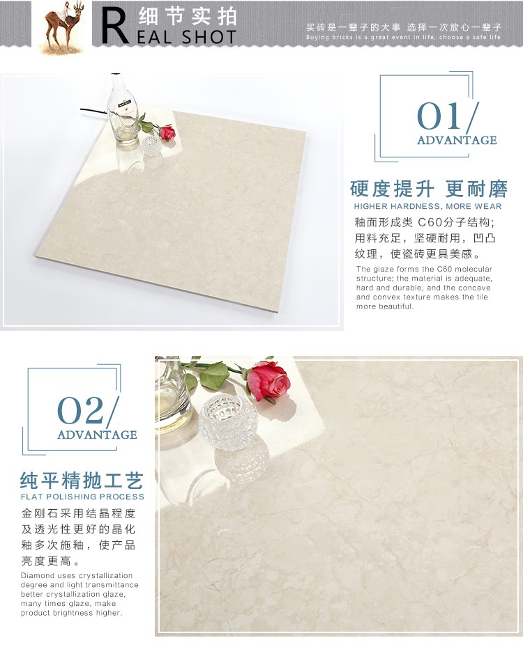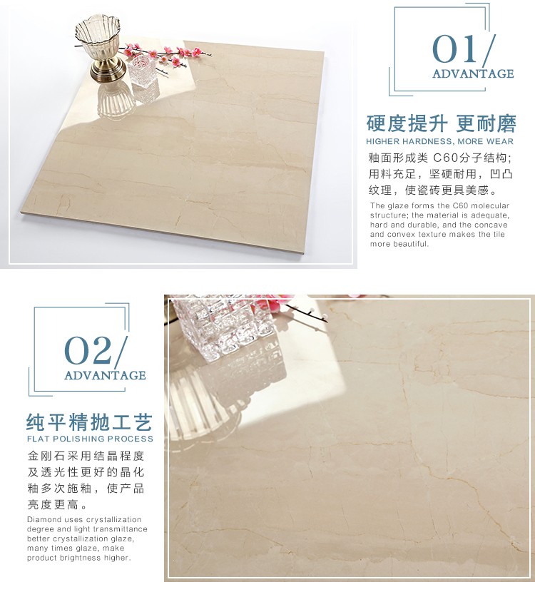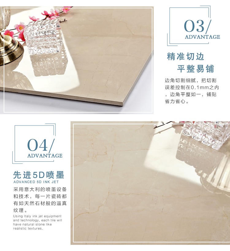 金曼古瓷磚廠家特價(jià)金剛石因高品質(zhì)而得名,是一款極具天然石材效果和微晶石質(zhì)感的仿石材瓷磚,它不但在價(jià)格、環(huán)保、耐用和清潔上極具優(yōu)勢(shì),在質(zhì)感、規(guī)格、花色、重量等指標(biāo)上,金剛石都遠(yuǎn)遠(yuǎn)勝于石材、拋光磚。相比其他種類的產(chǎn)品,它最大的特點(diǎn)可以用“高亮度、高耐磨、高平整、高逼真、高清晰、高環(huán)保”。