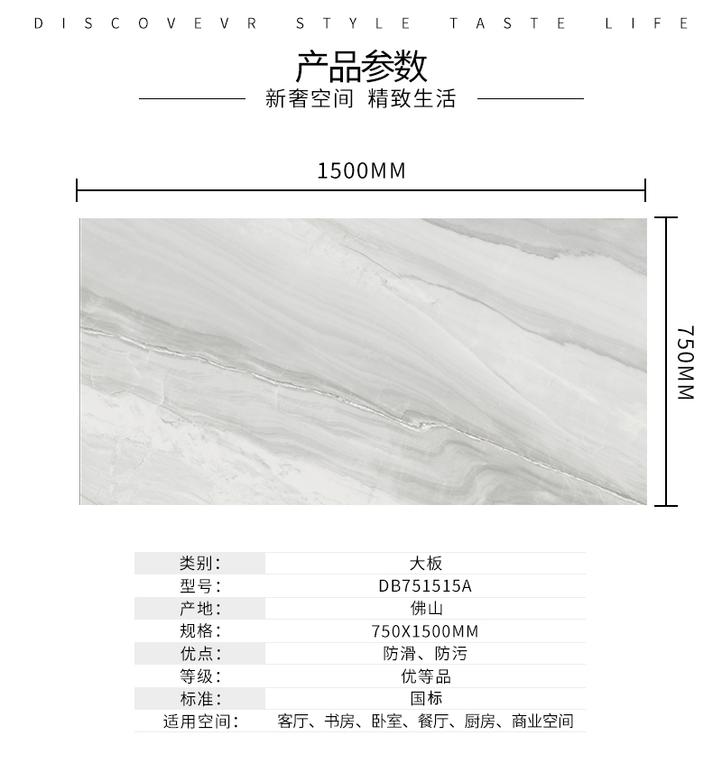 大規格瓷磚(DB751515A)-工程瓷磚 金曼古大規格瓷磚引進世界最先進的超大型壓機自動壓制而成,具有超大規格,超高硬度,超高致密度,超長時間煅燒,超低吸水率,超高光澤度。其磚面紋理流暢自然,效果逼真,適用于大型工程外墻干掛和酒店、商場、各辦公樓大堂等地面裝修